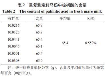 分別取6份鮮馬奶樣品進(jìn)行平行實(shí)驗(yàn),測定其棕櫚酸的含量,實(shí)驗(yàn)結(jié)果如表2。