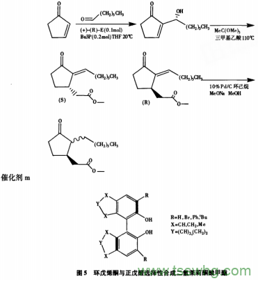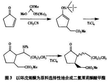 YasuyukiKita等人用一種含硅試劑與環(huán)戊烯酮反應(yīng)選擇性地合成二氫茉莉酮酸甲酯(圖3),產(chǎn)率為35%,得到的順式異構(gòu)體與反式異構(gòu)體之比為1/99,該路線的優(yōu)點(diǎn)是合成路線短,缺點(diǎn)是順式異構(gòu)體的產(chǎn)率及純度都很低。