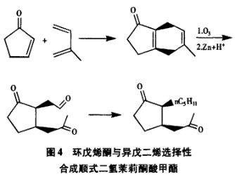 WenkertE等介紹了以異戊二烯和環(huán)戊烯酮為起始原料,利用Diel—Alder反應(yīng)的順式加成,來(lái)保證環(huán)戊酮上兩個(gè)取代基處在順式位置(圖4),但由于順式結(jié)構(gòu)在熱力學(xué)上的不穩(wěn)定性,使其在后續(xù)步驟中多發(fā)生異構(gòu)化,導(dǎo)致低產(chǎn)率和低純度。