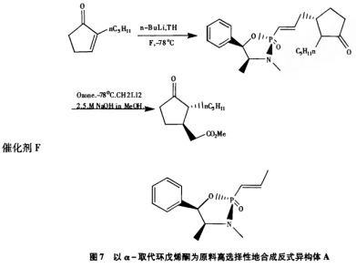 HelenC等人以一種含N、P的手性試劑對(duì)α一取代環(huán)戊烯酮的加成來(lái)合成二氫茉莉酮酸甲酯,得到A異構(gòu)體(產(chǎn)率48%,反式異構(gòu)體的ee值為91%)(圖7),該反應(yīng)雖然得到反式異構(gòu)體A,但A異構(gòu)體的香氣強(qiáng)度與c是最接近的,且立體選擇性高,產(chǎn)物容易通過(guò)一部反應(yīng)而實(shí)現(xiàn),具有很高的合成價(jià)值,但是所選用的手性試劑的制備有一定難度。