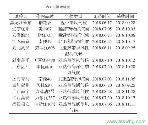 最終殘留田間試驗于2018年在黑龍江、遼寧、安徽、江蘇等12地進行,試驗地信息見表1。按農(nóng)作物中農(nóng)藥殘留試驗準則要求設試驗小區(qū),試驗設置1個處理小區(qū)和1個對照小區(qū)。每個小區(qū)面積不小于100m2,小區(qū)之間設置保護行,每個處理重復3次。