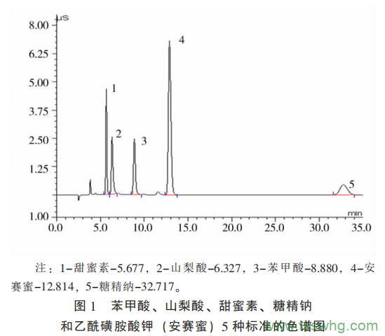碳酸飲料中苯甲酸、山梨酸、甜蜜素、糖精鈉和乙?;前匪徕浗汚S19色譜柱分離后,以保留時間定性,峰面積定量。