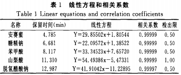 對混標(biāo)稀釋后濃度為0.01,0.03,0.05,0.07,0.09,0.10mg/mL的標(biāo)準(zhǔn)系列溶液進(jìn)行測定,以質(zhì)量濃度為橫坐標(biāo),峰面積為縱坐標(biāo),繪制標(biāo)準(zhǔn)曲線,分別得到回歸方程,見表1。安賽蜜、糖精鈉、苯甲酸、山梨酸、脫氫醋酸鈉這5種添加劑的出峰圖見圖1,按照出峰的時間分別是安賽蜜、糖精鈉、苯甲酸、山梨酸、脫氫醋酸鈉。