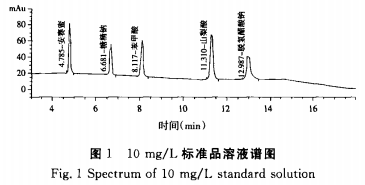 WatersSymmetryShieldC18(150mm×4.6mm,5μm)色譜柱,流動相為0.02mol/L乙酸銨一甲醇(100+5)緩沖溶液,檢測波長為220mm,紫外檢測器,柱溫25℃,流速1mL/min,進(jìn)樣量10μL。