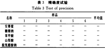 由表3可知,進(jìn)行6次平行試驗(yàn)均無檢出添加劑,可能的情況是含有添加劑,但含量低于檢出限導(dǎo)致未檢出;另一種情況是均不含添加劑,故無檢出。上述2種情況均達(dá)到標(biāo)準(zhǔn),結(jié)果判定為水煮薇菜不含有安賽蜜、糖精鈉、苯甲酸、山梨酸、脫氫醋酸鈉5種添加劑。