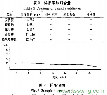 對比圖1和圖2可以看出,圖2中的譜圖沒有在相應(yīng)位置出峰,所以水煮薇菜樣品中不含有安賽蜜、糖精鈉、苯甲酸、山梨酸、脫氫醋酸鈉這5種食品添加劑。
