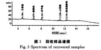 試驗(yàn)表明:對樣品進(jìn)行破碎、浸提后,使用WatersSymmetryShieldC18(150mm×4.6mm,5μm)色譜柱,流動相為0.02mol/L乙酸銨一甲醇(100+5)緩沖溶液,檢測波長為220mm,紫外檢測器,柱溫25℃,流速1mL/min,進(jìn)樣量10μL時,混標(biāo)中安賽蜜、糖精鈉、山梨酸、苯甲酸、脫氫醋酸鈉的出峰時間分別為4.785,6.681,8.117,11.310,12.987min,樣品中未檢出。不同回收率表明在實(shí)驗(yàn)操作過程中,會有不明原因的損失,可能是提取時間不足,可能是提取試劑還有待改善,還有可能是檢測時間不及時,導(dǎo)致部分添加劑降解。在國標(biāo)中以水煮薇菜為例,使用反提法檢測5種食品添加劑,方法簡便,可以節(jié)約大量人力、物力,節(jié)約成本和資源,加快工作效率。