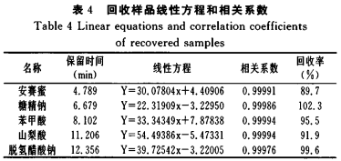 由圖3和表4可知,人為加入含有混標(biāo)的樣品檢測結(jié)果是含有添加劑的,且同一種方法回收得到的添加劑含量不同?;厥章士梢宰C明該方法得到的結(jié)果可信,因?yàn)樵谇疤幚磉^程中提取得到的添加劑會有一定程度的損失;當(dāng)回收率低于100%時證明提取不完全或者有損失;當(dāng)回收率高于100%時,說明樣品中同時也含有該添加劑。本法的相關(guān)系數(shù)均在0.999以上,回收率在89%以上,說明試驗(yàn)結(jié)果可靠。