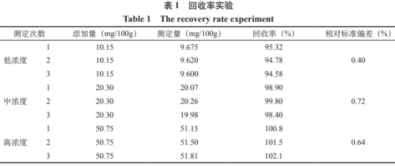 選用空白試劑加標的方法來驗證回收率,分別添加低、中、高3個濃度,按照上述方法測定后計算加標回收率及相對標準偏差,結果如表1。
