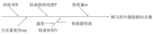 從測量方法、數(shù)學模型及實際實驗操作可知,鮮馬奶中脂肪酸測量的不確定度來源主要包括:稱取樣品誤差m、移取試劑體積誤差V、標準物質(zhì)純度誤差P、方法重復性誤差rep、方法回收率誤差R等。魚骨圖分析如下: