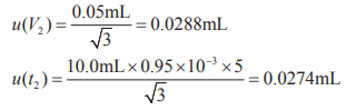 ②依據(jù)“JJG196-2006常用玻璃量具檢定規(guī)程”,0~10.00mL量程的A級分度移液管的最大允差為±0.05mL。實驗室溫度波動在20±5℃時,正己烷的膨脹系數(shù)(參照汽油)為0.95×10-3/℃。按照均勻分布,吸取10.0mL正己烷的吸量管的標準不確定度和溫度引起的體積標準不確定度為: