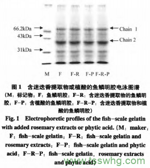 如圖1所示,薄層電泳分析顯示,純魚鱗明膠的分析量非常相近,與對照明膠溶液(F)相比,魚鱗明膠溶液中加入植酸(F-P)對電泳譜圖幾乎沒有影響。添加了迷迭香提取物的魚鱗明膠(F-R和F-R-P),在鏈1和鏈2之間的蛋白質(zhì)量有所增加,但<31KDa的小分子水解物沒有明顯增加,新的蛋白片段可能位于譜圖的上部區(qū)域。這一結(jié)果顯示,迷迭香提取物中的多酚類物質(zhì)與魚鱗多肽之間存在一定的相互作用。