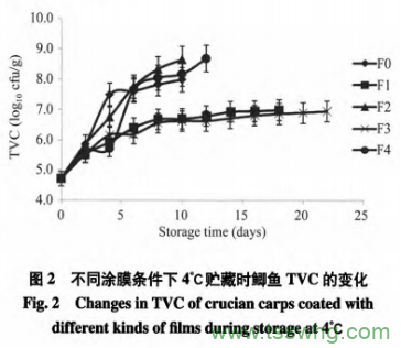 水產(chǎn)品的腐敗變質(zhì)大多數(shù)是由于微生物的作用而引起的,在運輸和貯藏過程中都會產(chǎn)生微生物的污染,而微生物在生長繁殖過程中會生成酶和毒性物質(zhì),使肌肉組織發(fā)生分解進(jìn)而發(fā)生變質(zhì)。微生物的耐低溫能力強(qiáng),4℃低溫不足以遏制微生物的生長,通過細(xì)菌總數(shù)的變化可以判斷鯽魚的鮮度,結(jié)果如圖2所示,貯藏初期,對照組與處理組樣品的菌落總數(shù)差異并不明顯(p>0.05),隨著貯藏時間的延長,所有樣品的菌落總數(shù)均呈上升趨勢。最初鯽魚的菌落總數(shù)為4.7logCFU/g,F(xiàn)O組樣品從第4天開始顯著加快,在貯藏到第6天時,F(xiàn)2和F4組樣品的菌落總數(shù)也分別達(dá)到7.751ogCFU/g和7.671ogCFU/g,與F0組的7.62logCFU/g相接近,無顯著差異p>0.05)。有研究表明,迷迭香提取物并不能抑制綠膿桿菌和假單胞菌的生長,但是假單胞菌是引起魚類腐敗的重要原因之一。F1組樣品在第18天時,菌落總數(shù)為6.99logCFU/g,第22天時,F(xiàn)3組樣品菌落總數(shù)為6.95logCFU/g,F(xiàn)1組與F3組在貯藏18天時無顯著性差異。從圖中可以看出,F(xiàn)1和F3組中菌落總數(shù)得到明顯抑制,這是由于魚鱗明膠對腐敗細(xì)菌的抑制作用,而不是植酸的作用。