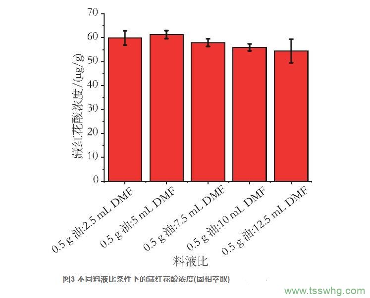 如圖3所示,固相萃取的結(jié)果表明:當(dāng)料液比為油:正己烷=0.5 g:5 mL時,固相萃取得到藏紅花酸濃度最高,為61.27 μg/g。