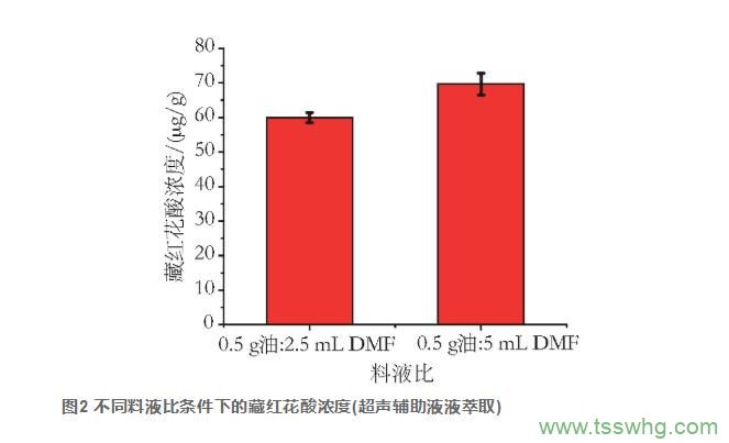 超聲輔助液液萃取的實驗結(jié)果表明:隨DMF體積逐漸增加,溶液逐漸渾濁,7.5 mL及其以上的溶液清澈度很低,不具有透光性。DMF體積在12.5 mL時,溶液離心后不分層。因此,DMF體積為7.5、10 mL和12.5 mL的樣品不能進(jìn)行液相分析。對2.5 mL DMF和5 mL DMF的梔子油萃取物進(jìn)行液相分析,結(jié)果如圖2所示:5 mL DMF時藏紅花酸濃度平均值為69.65 μg/g,高于2.5 mL DMF時藏紅花酸濃度平均值為59.93 μg/g。因此,在超聲輔助液液萃取條件下,最優(yōu)料液比選擇0.5 g油:5 mL DMF。