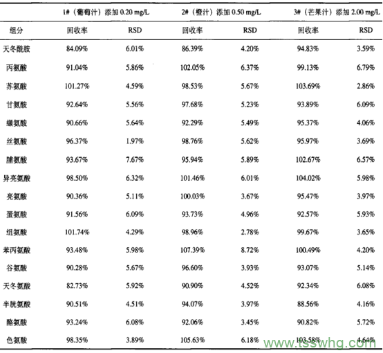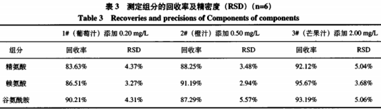 從表3中可以看出,在0.20mg/L和0.50mg/L添加濃度水平下,精氨酸、賴氨酸、谷氨酰胺、天冬酰胺、天冬氨酸的回收率相對(duì)較低,回收率多數(shù)在82%~90%之間,但依然滿足食品理化檢驗(yàn)技術(shù)要求(測(cè)定含量小于O.10mg/L,回收率應(yīng)在60%~120%)。20種組分三濃度水平添加回收率在82.73%~107.39%之間,RSD在1.97%~8.72%范圍內(nèi),這說(shuō)明20種氨基酸測(cè)定回收率好。從總體上來(lái)看,三種基質(zhì)、六次平行測(cè)定回收率數(shù)據(jù)結(jié)果符合食品理化檢測(cè)要求,表明方法準(zhǔn)確性高、精密度好。