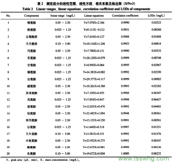 配置20種氨基酸的混合標(biāo)準(zhǔn)工作液,并進(jìn)行校準(zhǔn)曲線擬合。通過(guò)色譜峰信噪比來(lái)計(jì)算待測(cè)組分的檢出限(S/N=3),在0.05mg/L~2.50mg/L濃度范圍內(nèi),進(jìn)行了6個(gè)不同濃度水平(0.05、0.10、0.20、0.50、1.0、2.50mg/L)標(biāo)準(zhǔn)工作液的檢測(cè)和線性擬合。結(jié)果(見(jiàn)表2)表明,20種組分線性相關(guān)系數(shù)均大于0.995,其中有15種組分相關(guān)系數(shù)大于0.999,說(shuō)明在該實(shí)驗(yàn)條件下,20種組分同時(shí)檢測(cè)時(shí)線性相關(guān)性良好。20種組分檢出限在0.00107~0.06427mg/L之間,除了個(gè)別亮氨酸、異亮氨酸、色氨酸外,其他17種檢出限均小于0.05mg/L。