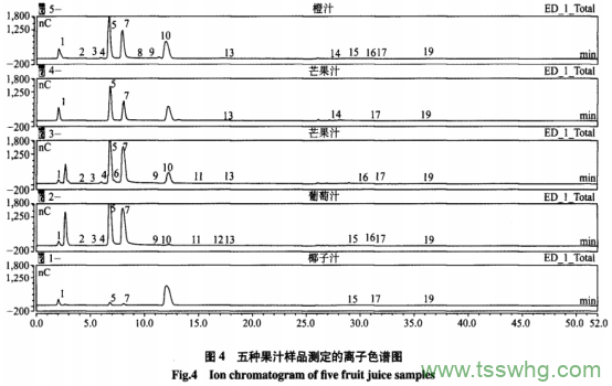 隨機(jī)抽取5種常見(jiàn)果汁飲料(橙汁、芒果汁、蘋果汁、葡萄汁、椰子汁),按照離子色譜儀:ICS5000+;色譜柱:AminoPacPAl0(2×250mm),保護(hù)柱:AminoPacPAl0(2×50mm);積分安培檢測(cè);工作電極:Gold(au)-AAA;參比電極:pH電極;電位波形:G10d,pH-Ag-AgClRE,舭A;流動(dòng)相:A-NaOH溶液,B-去離子水,C-醋酸鈉溶液;流速:0.25mL/min;柱溫:30℃;進(jìn)樣量:25μL中離子色譜條件和準(zhǔn)確取果汁待檢樣品0.100g,加入去離子水約150min,搖勻、靜置15min,調(diào)節(jié)稀釋液pH至5.5~7.0,全部轉(zhuǎn)移至200mL容量瓶中,采用去離子水定容至刻度,搖勻、靜置15min,取10.0mL溶液,先過(guò)0.229m水相濾膜,再過(guò)已預(yù)活化的RP柱,棄去前3mL,收集清液,待上機(jī)檢測(cè),進(jìn)行了實(shí)際樣品中氨基酸含量的檢測(cè)分析,圖4是實(shí)際樣品測(cè)定離子色譜圖。