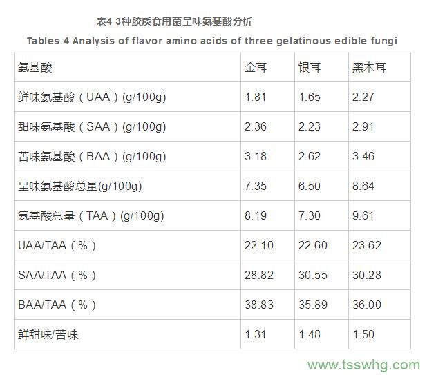 通過分析金耳、銀耳、黑木耳3種膠質(zhì)食用菌的營養(yǎng)成分可知,3種膠質(zhì)食用菌的基本營養(yǎng)成分含量存在差異,但均含有豐富的糖類、蛋白質(zhì)、礦物質(zhì)等營養(yǎng)成分,低脂肪,高纖維含量,并且含有17種氨基酸,其中包含人體必需氨基酸7種。谷氨酸和天門冬氨酸等鮮味氨基酸含量較高,通過呈味氨基酸含量分析可知,鮮甜味氨基酸的總量占苦味氨基酸的比例為1.31 ~1.50倍之間,表明3種膠質(zhì)食用菌都是以鮮甜味氨基酸為主。3種膠質(zhì)食用菌的必需氨基酸占總氨基酸的質(zhì)量分?jǐn)?shù)均高于FAO/WHO氨基酸模式譜,其SRC 值由高到低分別為銀耳(82.25)>黑木耳(78.09)>金耳(77.98),均在80左右,營養(yǎng)價(jià)值與利用率較高。綜合分析認(rèn)為:3種膠質(zhì)食用菌蛋白質(zhì)營養(yǎng)價(jià)值差別不明顯,都是含有較高蛋白質(zhì),低脂肪、高纖維、高總糖含量的菌類,具有較高營養(yǎng)價(jià)值和保健食品開發(fā)前景。