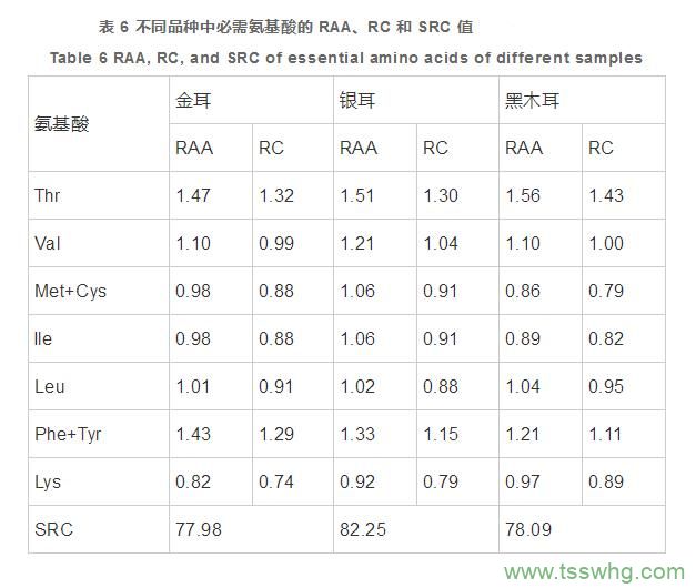 根據(jù)表5中得到的必需氨基酸占總氨基酸的質(zhì)量分?jǐn)?shù),可以計(jì)算出3種膠質(zhì)食用菌的 RAA、RC 和 SRC,從而對(duì)其營養(yǎng)價(jià)值進(jìn)行直觀評(píng)價(jià),結(jié)果見表6。由表 6 中 RC 值可知,3種膠質(zhì)食用菌過剩和不足的必需氨基酸不盡相同,但總的來說,Thr和Phe+Tyr 在3種膠質(zhì)食用菌中均相對(duì)過剩;Val在金耳中稍顯不足,而在銀耳、黑木耳中相對(duì)過剩;Met+Cys、Ile、Leu、Lys在3種膠質(zhì)食用菌中均表現(xiàn)為相對(duì)不足。SRC是引入氨基酸平衡理論結(jié)合FAO/WHO評(píng)價(jià)模式建立的蛋白質(zhì)評(píng)價(jià)指標(biāo)。3種膠質(zhì)食用菌 SRC 值由高到低分別為銀耳(82.25)>黑木耳(78.09)>金耳(77.98),均在80左右,三者差別不明顯,說明這3種膠質(zhì)食用菌之間氨基酸營養(yǎng)價(jià)值差別不大。