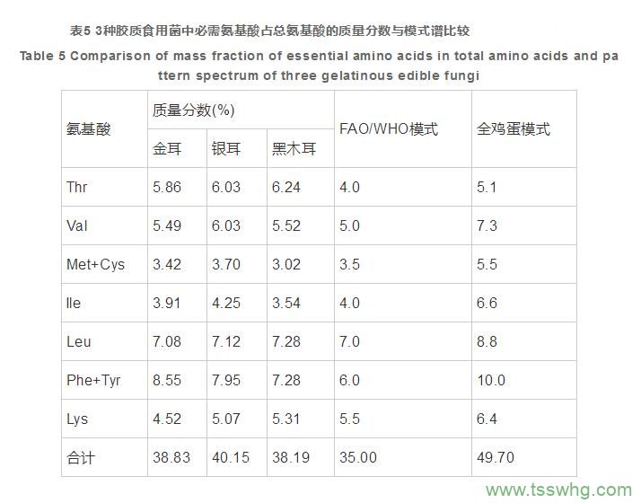 本研究將3種膠質(zhì)食用菌必需氨基酸 EAA 值與FAO/WHO模式譜和優(yōu)質(zhì)蛋白質(zhì)全雞蛋模式譜中相應(yīng)氨基酸的 EAA值進(jìn)行比較,結(jié)果見表5。3種膠質(zhì)食用菌的必需氨基酸總量均高于FAO/WHO氨基酸模式,低于優(yōu)質(zhì)蛋白質(zhì)全雞蛋模式。銀耳中除Lys比FAO/WHO模式譜稍低外,其他必需氨基酸的EAA值均高于FAO/WHO模式譜;金耳、黑木耳中Met+Cys、Ile和Lys的EAA值低于FAO/WHO模式譜,Thr、Val、Leu、Phe+Tyr的EAA值均高于 FAO/WHO模式譜。跟全雞蛋模式譜相比,3種膠質(zhì)食用菌樣品除了Thr高于全雞蛋模式外,其他必需氨基酸的EAA 值均低于模式譜。一般來說,植物性蛋白常相對(duì)缺少賴氨酸、蛋氨酸、蘇氨酸和色氨酸等必需氨基酸,所以其營養(yǎng)價(jià)值相對(duì)較低。而檢測發(fā)現(xiàn)3種膠質(zhì)食用菌中的蘇氨酸含量較高,都高于FAO/WHO模式譜和優(yōu)質(zhì)蛋白質(zhì)全雞蛋模式譜中蘇氨酸的 EAA值,而蘇氨酸又是小麥、大米、燕麥等主食的第二限制氨基酸。在實(shí)際應(yīng)用中,可考慮將食用菌和主食或其他食物混合食用,以實(shí)現(xiàn)蛋白質(zhì)的互補(bǔ)作用,提高食物蛋白質(zhì)營養(yǎng)價(jià)值。