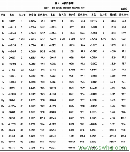 本實(shí)驗(yàn)通過向硫酸鈀試樣中加人不同含量的標(biāo)準(zhǔn)溶液,按1.3中的試驗(yàn)方法進(jìn)行處理和測定,計(jì)算各元素的加標(biāo)回收率來驗(yàn)證方法的準(zhǔn)確度。結(jié)果見表4。表4中的數(shù)據(jù)表明,本方法中22個(gè)元素的加標(biāo)回收率在87.2%一109.7%之間,準(zhǔn)確度較高,能夠滿足實(shí)際生產(chǎn)部門對硫酸鈀產(chǎn)品雜質(zhì)分析準(zhǔn)確度的要求。