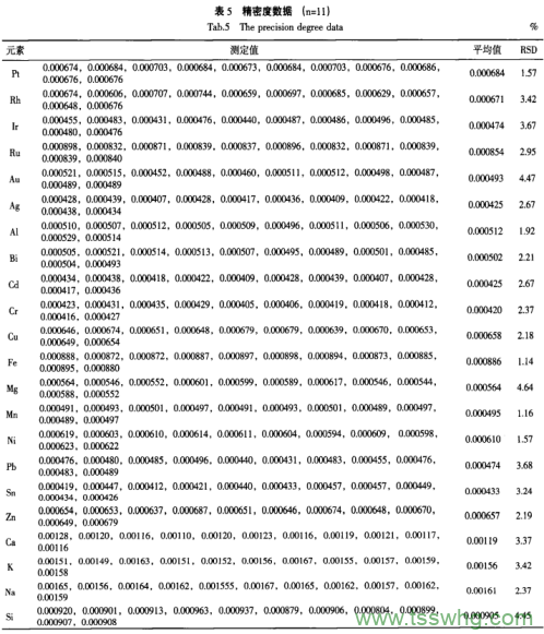 本實(shí)驗(yàn)平行稱取硫酸鈀溶液11份,各加入0.1μg/mL(Ca、K、Na、si加入0.2μg,mL)所測元素標(biāo)準(zhǔn)儲備液,按實(shí)驗(yàn)方法處理后進(jìn)行測定,統(tǒng)計(jì)各雜質(zhì)元素的相對標(biāo)準(zhǔn)偏差驗(yàn)證方法精密度,結(jié)果見表5,從中可以看出,方法精密度在1.14%~4.64%之間。