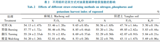 表2結(jié)果顯示,油菜氮磷鉀收獲指數(shù)受稻稈還田方式和土壤類型影響。氮收獲指數(shù)在2種土壤的表現(xiàn)均以焚燒處理最高,分別比CK顯著提高3.64(麻城土),4.64(陽邏土)百分點。磷收獲指數(shù)除陽邏土的焚燒處理略有增加外(比CK提高2.11百分點,但差異不顯著),其他處理反而有下降趨勢。鉀收獲指數(shù)在2種土壤的表現(xiàn)剛好相反,焚燒、翻壓和覆蓋處理,相比CK,麻城土分別下降0.80,0.96,1.12百分點,其中覆蓋處理下降顯著,陽邏土分別增加0.33,0.34,0.19百分點,但差異均不顯著。稻稈還田雖然能增加油菜對鉀的總累積量,但由于鉀素主要分配于油菜莖稈、角殼等非經(jīng)濟(jì)部位,油菜氮磷鉀收獲指數(shù)氮>磷>鉀。