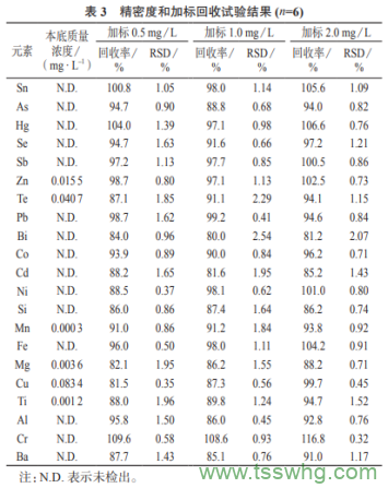 由表3可知,以硫氰酸鉀作為沉淀劑,21種元素分別在0.5、1.0、2.0mg/L3種加標(biāo)濃度下,回收率依次為81.5%~109.6%、80.0%~108.6%、81.2%~116.8%,測定結(jié)果的相對標(biāo)準(zhǔn)偏差(n=6)分別為0.35%~1.96%、0.41%~2.54%、0.32%~2.07%,表明該方法有較高的準(zhǔn)確度與精密度,滿足分析測試質(zhì)量控制要求。