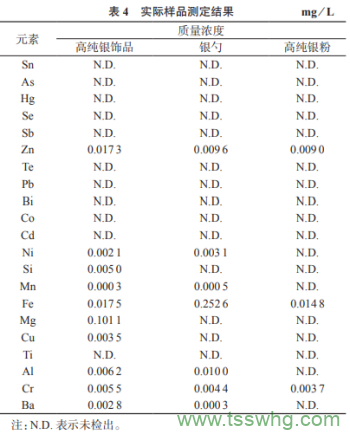 采用所建方法對市面上銷售的高純銀飾品(銀含量標(biāo)稱值為999.9‰)、銀勺(銀含量標(biāo)稱值為999.9‰)及化學(xué)試劑中的高純銀粉(銀含量標(biāo)稱值為999‰)分別進(jìn)行測試,結(jié)果見表4。由表4可知,待測樣品中檢測出鋅、鎳、硅、錳、鐵、鎂、銅、鋁、鉻、鋇等雜質(zhì)元素。與之相比,現(xiàn)行國家標(biāo)準(zhǔn)GB/T38162-2019測試元素中不包含鋇元素,而GB/T11067-2016系列標(biāo)準(zhǔn)中則不包含鎳、錳、硅、鎂、鋁、鉻、鋇7種元素的測試方法,因此所建方法可覆蓋更多非貴金屬雜質(zhì)元素,適用于高純銀制品中雜質(zhì)元素含量的測定。