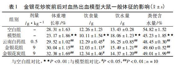 3.1金銀花炒炭前后對血熱出血模型大鼠體重增長率、飲食量、飲水量、糞便含水量的影響