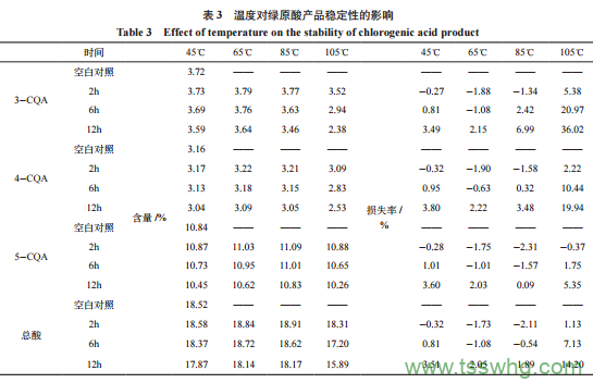 由表3可知,從45℃~105℃,甜葉菊綠原酸類(lèi)成分受熱溫度越高、時(shí)間越長(zhǎng),含量減少越多;其中3-CQA的含量減少最多,4-CQA次之,5-CQA減少最少。45℃~85℃范圍內(nèi),甜葉菊綠原酸類(lèi)成分損失率相近,105℃下甜葉菊綠原酸類(lèi)成分損失率明顯升高。