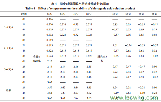 在不同溫度下加熱2h、4h、8h,3-CQA、4-CQA、5-CQA含量和總酸含量均在一定范圍內(nèi)波動(dòng),可以認(rèn)為在55℃~85℃下,加熱8h對(duì)綠原酸產(chǎn)品溶液穩(wěn)定性無(wú)影響。
