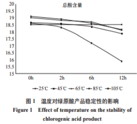 本研究以甜葉菊綠原酸為研究對(duì)象,考察了多種條件對(duì)甜葉菊綠原酸穩(wěn)定性的影響,其中對(duì)產(chǎn)品穩(wěn)定性影響較大,使綠原酸總含量變化達(dá)到7%以上的條件有溫度、pH;對(duì)產(chǎn)品穩(wěn)定性影響較小,綠原酸總含量變化<7%的條件有光照、氧氣、金屬離子。