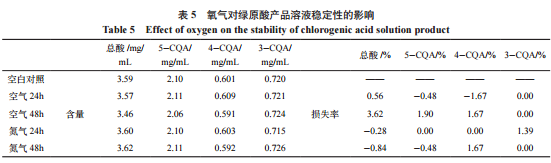在通入空氣的情況下,48h后總綠原酸損失率為3.62%,而通氮?dú)獾臉悠穭t無(wú)損失。數(shù)據(jù)表明,在0~24h內(nèi),綠原酸產(chǎn)品溶液受到氧氣影響減少0.56%,而放置48h后減少3.62%,說(shuō)明綠原酸產(chǎn)品溶液會(huì)在有氧條件下綠原酸含量逐漸降低。