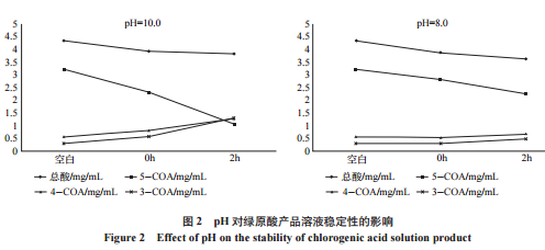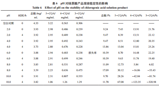 調(diào)pH后和原始綠原酸溶液對(duì)比,各pH條件下的總酸含量都發(fā)生損失。其中,在pH=8.0條件下,總酸含量損失17.09%,損失最多。在pH=4.0和pH=8.0條件下,放置4h后溶液中的綠原酸含量相比于0h,損失率分別為4.85%和6.75%,而在pH=10.0時(shí),4h后損失率為2.3%。在堿性環(huán)境下(pH=8.0、pH=10.0)放置,總酸含量的損失率處于平均水平,但5-CQA含量明顯減少,4-CQA、3-CQA含量明顯升高,且3-CQA含量升高更多。原因是3-CQA和5-CQA在水解時(shí)更趨向于轉(zhuǎn)化為4-CQA,而4-CQA水解時(shí)更趨向于轉(zhuǎn)化為3-CQA,而非5-CQA。
