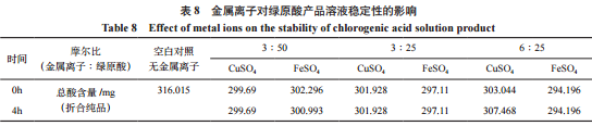 溶液中金屬離子和綠原酸的摩爾比為3∶50、3∶25和6∶25時(shí),綠原酸的損失率<7%,4h和0h相比基本沒(méi)有變化??梢哉J(rèn)為金屬離子的加入會(huì)引起綠原酸少量損失。