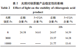 甜葉菊綠原酸產(chǎn)品在0lx光照強(qiáng)度下總酸含量為24.67%,5-CQA含量為14.59%,含量無(wú)損失;3000lx光照下總酸含量減少1.3%,5-CQA含量減少0.31%;10000lx光照強(qiáng)度下總酸含量減少2.9%,5-CQA含量減少1.1%。數(shù)據(jù)表明光照強(qiáng)度越高,綠原酸類成分含量減少的幅度越大。