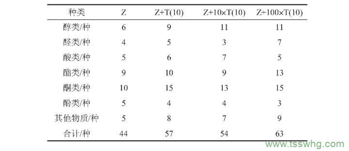 利用SPME-GC-MS對模擬低鹽快速發(fā)酵醬油樣品中的揮發(fā)性風味物質進行檢測并分析,結果見表3。由表3可知,采用不同菌株添加方式發(fā)酵的醬油中所檢測到的揮發(fā)性風味物質種類差異較大。其中發(fā)酵開始添加魯氏接合酵母并在10d添加108CFU/g嗜鹽四聯(lián)球菌的醬油中揮發(fā)性物質種類最多,達到63種;只添加酵母菌的醬油中揮發(fā)性物質種類最少,僅為44種。此外,共同添加嗜鹽四聯(lián)球菌和魯氏接合酵母進行發(fā)酵的醬油中風味物質種類都高于單獨添加魯氏接合酵母發(fā)酵的醬油,說明嗜鹽四聯(lián)球菌與酵母菌協(xié)同作用有助于顯著提高醬油中揮發(fā)性風味物質的種類。