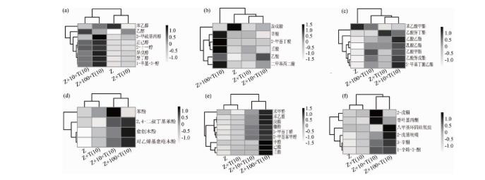 為進一步揭示嗜鹽四聯(lián)球菌和魯氏接合酵母通過協(xié)同作用對醬油風味的貢獻,通過文獻總結,對醬油中主要風味物質進行聚類分析來鑒別與所強化菌株相關的風味物質合成,結果見圖6。由圖6可知,模擬低鹽快速發(fā)酵醬油樣品中含量較多的醇類化合物主要有乙醇、異丁醇、異戊醇、1-辛烯-3-醇、2-十一醇、苯乙醇等,嗜鹽四聯(lián)球菌的添加量對這些醇類含量的增加起到重要作用(圖6a),其中發(fā)酵開始添加魯氏接合酵母并在10d添加107CFU/g或者108CFU/g嗜鹽四聯(lián)球菌醬油樣品中1-辛烯-3-醇含量比單獨添加酵母菌分別提高了6.4倍和8.9倍。