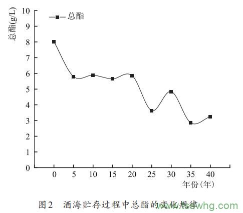 由圖2可看出,酒海貯存過程中總酯的變化趨勢為:先降低、貯存5~20年間總酯基本趨于穩(wěn)定,貯存20~40年間不斷波動,其總體變化趨勢為減少。其中:鳳香型白酒新蒸餾出的酒樣,其總酯含量最高為8.02 g/L,其在貯存前5年變化較大,之后貯存5~20年趨于穩(wěn)定,貯存20年以上,其總酯波動性較大,在貯存第35年時,總酯含量最低,為2.85 g/L,之后在貯存40年有一定幅度的上升,但上升幅度不大。