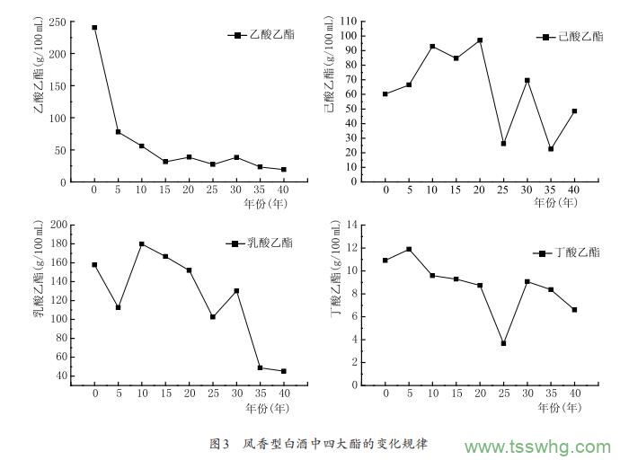 另外,主要酯類其總含量在鳳香型基酒新酒中是最高的,為469.27 mg/100 mL,貯存35年的總酯含量是最低的,為102.72 mg/100 mL,其主要酯類總含量的總體是減少的趨勢。