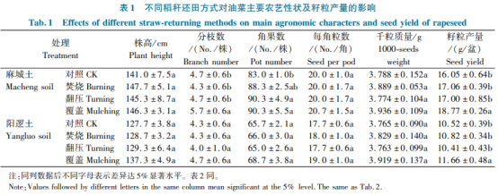 表1結(jié)果顯示,油菜分枝數(shù)因稻稈還田方式的不同有升有降,但稻稈還田能在一定程度上提高油菜的株高、角果數(shù)和籽粒產(chǎn)量,3種不同還田方式以覆蓋最好,該處理的籽粒產(chǎn)量顯著高于其他3個處理。相比CK,覆蓋處理的籽粒產(chǎn)量,麻城土提高16.9%、陽邏土提高10.8%(平均提高13.9%);相比其他2種(焚燒和翻壓)處理,籽粒產(chǎn)量麻城土平均提高10.2%,陽邏土平均提高10.0%。秸稈還田對油菜籽粒產(chǎn)量的提高,主要通過增加單株有效角果數(shù)來實現(xiàn)(相比CK,角果數(shù)麻城土增加8.8%,陽邏土增加4.6%)。