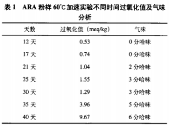 1、600C加速結(jié)果與GC—MS氣味分析結(jié)果對(duì)比將ARA粉樣將樣品放置在溫度60℃的儲(chǔ)藏條件下玻璃瓶加蓋封口存放,分別在0、12、21、25、30、35及40d對(duì)樣品進(jìn)行過(guò)氧化值、感官及氣味分析,樣品60℃加速實(shí)驗(yàn)的過(guò)氧化值結(jié)果與感官氣味變化見(jiàn)表1: