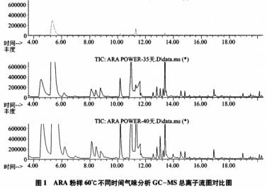 測(cè)取29樣品置于頂空進(jìn)樣瓶中,使用Agilent5975C一7890質(zhì)譜儀及7694E頂空進(jìn)樣器進(jìn)行樣品分析。氣相條件:柱溫升溫程序:起始溫度35℃,保持2min,然后以5℃,min升至200℃,保持2min;進(jìn)樣口溫度:200℃;載氣:He,流速1.0mL,minl進(jìn)樣方式:不分流進(jìn)樣。質(zhì)譜條件:電子轟擊離子源(EI);電子能量70eV;離子源溫度150℃,四級(jí)桿溫度230℃;傳輸線(xiàn)溫度280℃;全譜掃描,掃描質(zhì)量范圍30~350amu。頂空條件:頂空瓶溫度60℃,平衡時(shí)間10min,定量管溫度85℃,輸送線(xiàn)溫度100℃,加壓時(shí)間0.1min,進(jìn)樣時(shí)間2min,振搖2min。通過(guò)Agilent—MSD質(zhì)譜軟件和Nist08譜庫(kù)進(jìn)行檢索并結(jié)合人工解析,由質(zhì)譜軟件進(jìn)行數(shù)據(jù)處理,按峰面積歸一化法計(jì)算各組分的質(zhì)量分?jǐn)?shù)。的方法對(duì)60℃加速實(shí)驗(yàn)過(guò)程中的ARA粉樣進(jìn)行氣味分析,不同放置時(shí)間的GC—MS總離子流圖對(duì)比圖見(jiàn)圖1。同時(shí)將GC—MS氣味分析結(jié)果與60℃加速過(guò)程中的感官結(jié)果進(jìn)行比對(duì),確認(rèn)兩者之間的相關(guān)性。