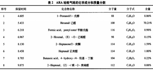 2、ARA粉劑完全哈敗時揮發(fā)性物質(zhì)的化學(xué)成分與相對百分比