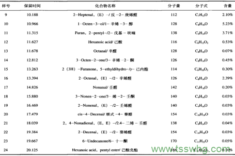 對60℃放置40天時已完全哈敗的ARA粉樣總離子色譜圖進行分析和處理,用NlST08譜庫系統(tǒng)檢索,從基峰相對豐度等幾個方面進行直觀比較,并查對有關(guān)質(zhì)譜資料和有關(guān)文獻共鑒定出24個化合物,其占ARA哈敗氣味成分總量的97.56%,各組分的保留時間及相對峰面積見表2。