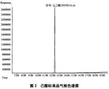 根據(jù)對60℃放置40天時已完全哈敗的ARA粉樣總離子色譜圖進行分析和處理,用NlST08譜庫系統(tǒng)檢索,從基峰相對豐度等幾個方面進行直觀比較,并查對有關(guān)質(zhì)譜資料定出24個化合物,其占ARA哈敗氣味成分總量的97.56%將己醛作為ARA微膠囊粉末哈敗的特征物質(zhì)開發(fā)了一種較簡便的ARA微膠囊粉末中己醛的檢測方法。稱取1g(精確至0.01g)樣品放入20mL頂空瓶中,加入5mL純水(常溫),蓋緊瓶蓋,振搖使樣品完全溶解。氣相條件:初始柱溫40℃,保持5min以10℃/min升至180℃,保持5min;進樣方式:分流模式,分流比:10∶1;進樣器溫度:200℃;檢測器溫度:250℃;恒壓控制:4psi。頂空條件:頂空瓶溫度70℃,平衡時間30min,定量管溫度80℃,輸送線溫度90℃,加壓時間0.5min,進樣時間0.05min。該方法前處理簡單,并通過實用性更強的氣相色譜配FID檢測器檢測ARA粉樣中的己醛含量,己醛標準品氣相色譜圖見圖2。