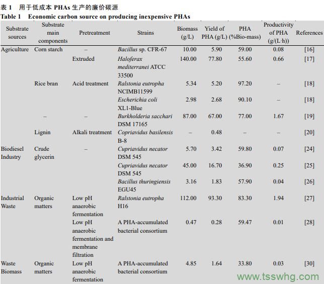 實(shí)現(xiàn)低成本PHAs生產(chǎn),尋找經(jīng)濟(jì)可行且穩(wěn)定高效合成PHAs的發(fā)酵物料是關(guān)鍵,尤其是占發(fā)酵物料總成本70%–80%的碳源替代物。合理利用廉價(jià)碳源,尤其是工農(nóng)業(yè)廢棄物料,能夠有效降低PHAs的生產(chǎn)成本,增加PHAs的市場(chǎng)競(jìng)爭(zhēng)力。