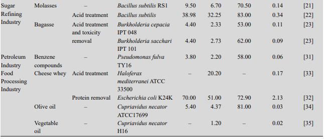 除此之外,表1中還列舉了其他可以用于低成本PHAs生產(chǎn)的碳源,例如石油煉制過(guò)程中的甲苯、乙苯、二甲苯等苯系化合物、奶酪加工過(guò)程中的乳清,油炸食品加工過(guò)程中的廢棄橄欖油、棕櫚油、葵花籽油等植物油。用于微生物發(fā)酵生產(chǎn)低成本PHAs的理想碳源種類(lèi)豐富,其中來(lái)自農(nóng)業(yè)、工業(yè)、城市排放和餐余垃圾的廢棄物料來(lái)源廣、體量大,更適用于低成本PHAs的生產(chǎn)。但是大部分廉價(jià)物料經(jīng)預(yù)處理后碳源濃度低、碳源成分復(fù)雜多樣、毒性化合物存在、生物量低等問(wèn)題為后期發(fā)酵策略的開(kāi)發(fā)提出了新的挑戰(zhàn)。